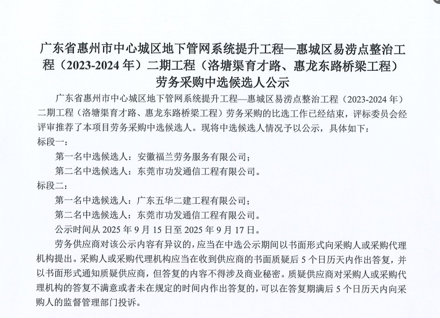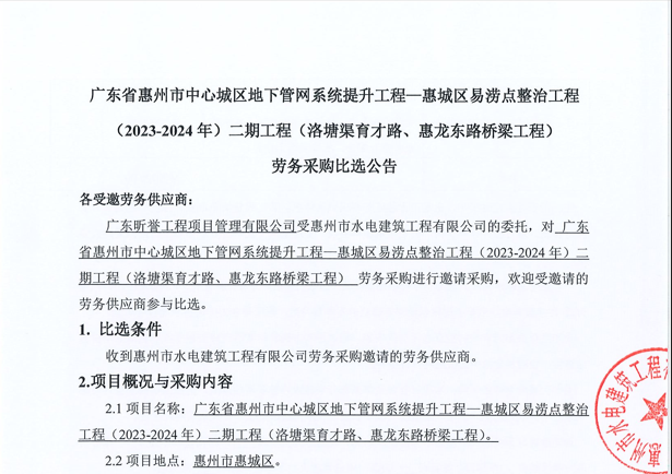 廣東省惠州市中心城區(qū)地下管網(wǎng)系統(tǒng)提升工程-內(nèi)街小巷排水管網(wǎng)病害修復(fù)及錯(cuò)混接改造項(xiàng)目一期施工勞務(wù)采購比選公告……